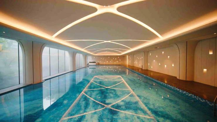 约500㎡艺术馆般泳池,天花、墙面以现代摩登的手法,抽取上海海派建筑造型为元素,打造充满静奢韵律的造型,搭配泳道尽端景泰蓝奢石背景墙,勾勒出一处臻享静美的精神之所。