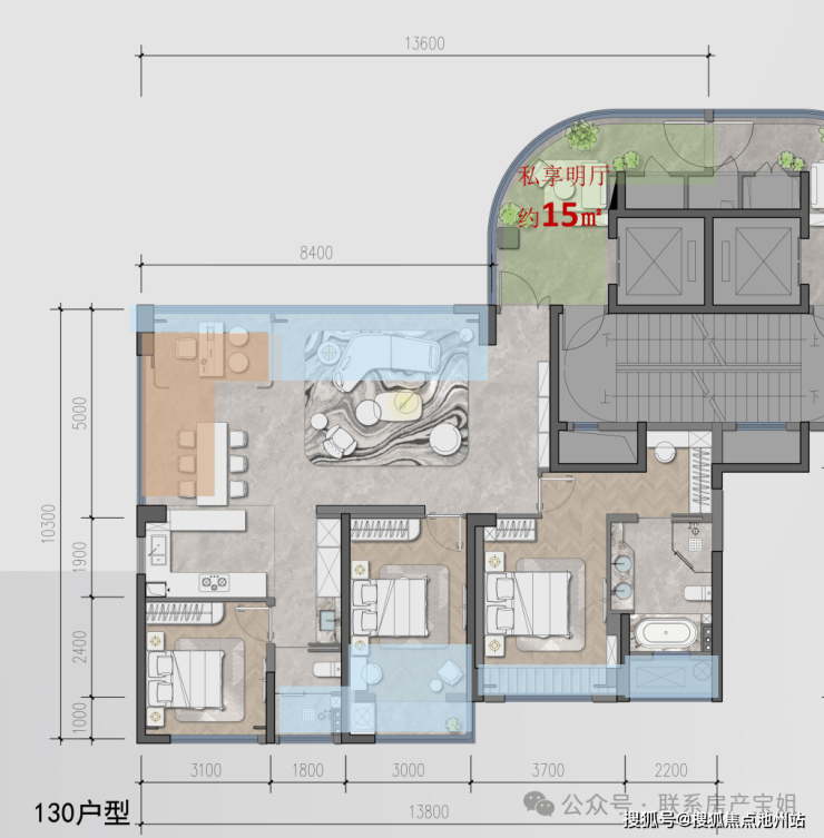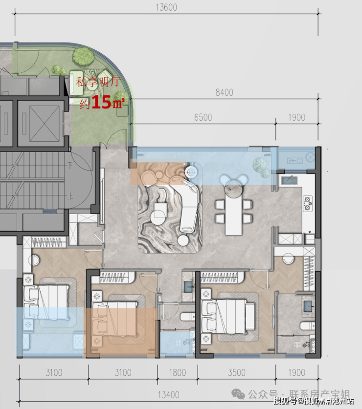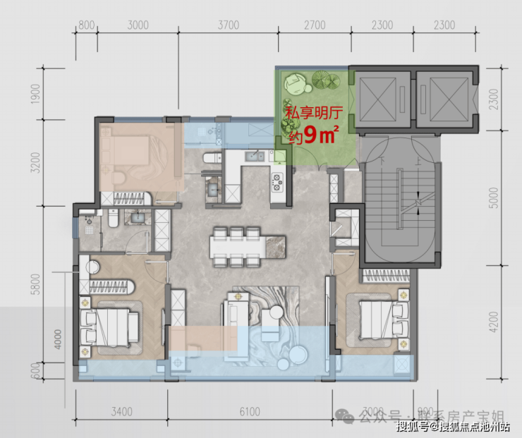 私享空间: 核心筒设计 独立私享入户光厅,安全私密,尊崇归家礼序。 生活场域:瞰江曲面光厅,弧形采光面,270°一线观江平台。空间利用:前厅开敞式设计,仅计容50%,增加户型使用率。功能多样:可作为储物间、入户花园、小型会客区,满足多样化需求。