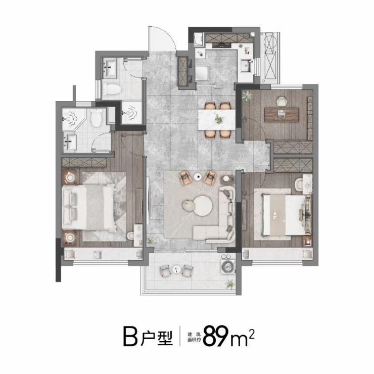 其中建筑面积约89㎡户型整体设计方正大气,南向三开间设计,两室朝南,全明采光,视野开阔;餐客厅一体化设计,连通瞰景大阳台,通风顺畅,清风徐来,既可延展全家人的欢趣活动空间,又能有一方亲近自然的诗意天地,莳花弄草,品茗对弈,生活自在悠然!