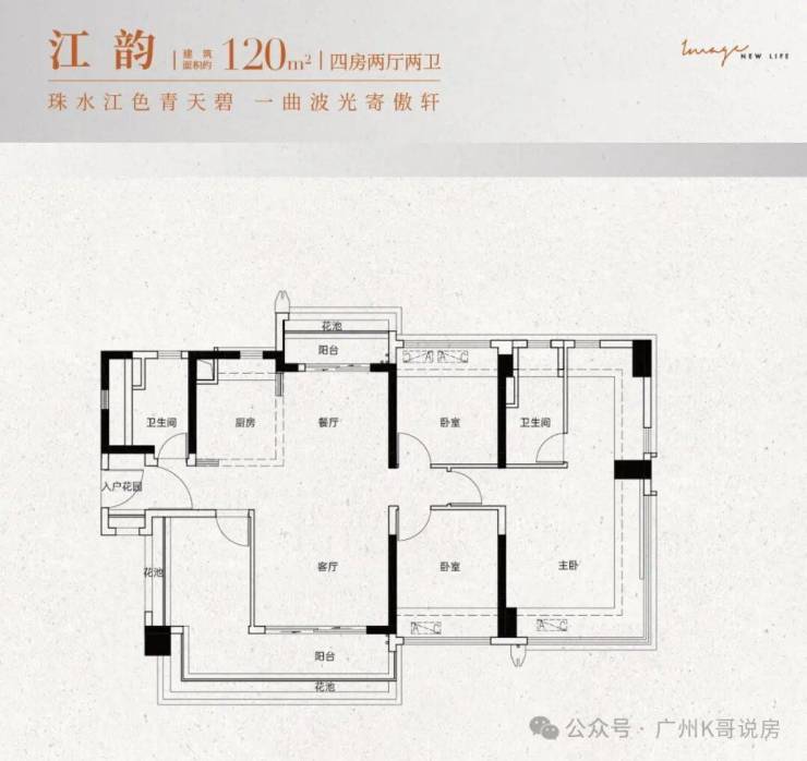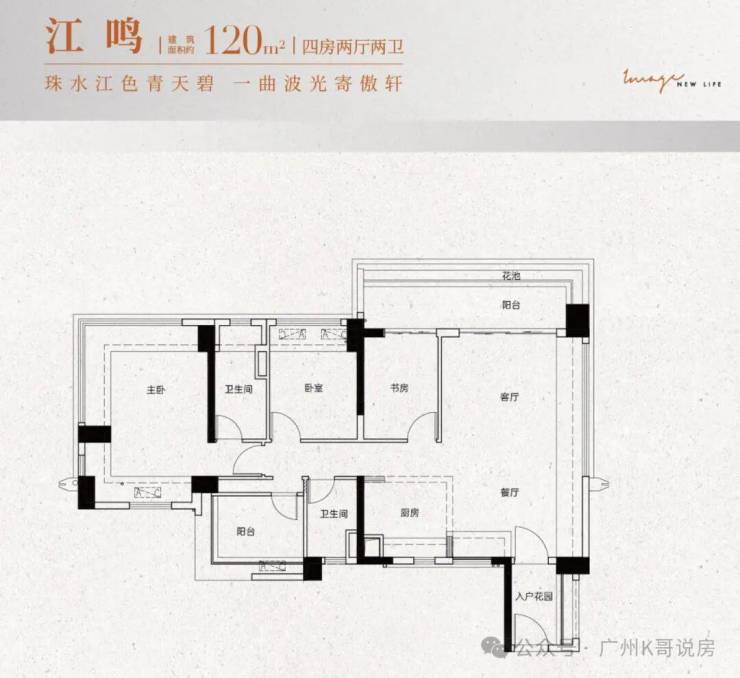 建面约120㎡:四房两厅两卫设计,四开间朝南,居住与生活动静分离,南向大阳台或南北双阳台,主卧带270°飘窗。