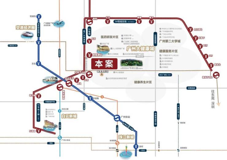 14号线地铁站钟落潭,新百广城轨,广佛环线15分钟白云机场北站,京港澳高速,机场第二高速,花莞高速,新广从快速路