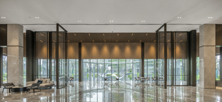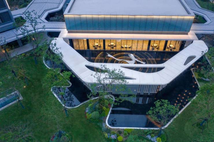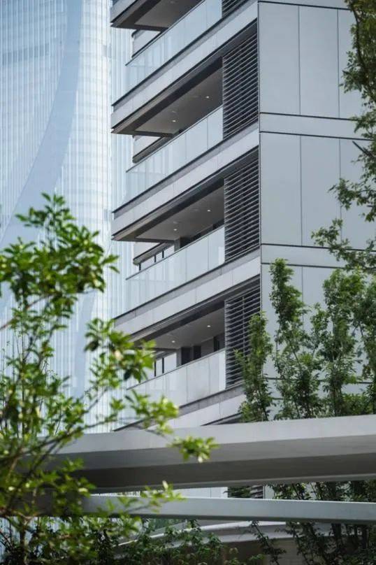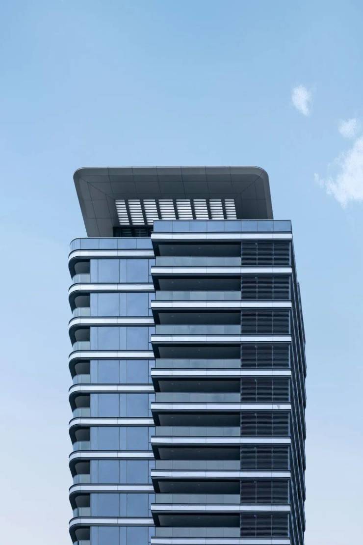 当臻奥院的建筑立面呈现在人们面前,大面玻璃与铝板山墙、线条组成的超高层建筑,结合飘顶的设计,给人一种玉树临风、吴带当风的轻盈感。