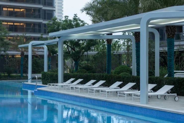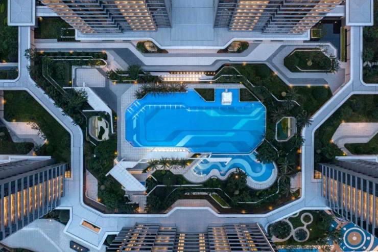 臻奥院的景观和会所,营造出一种酒店般的度假风格。尤其是堆高的室外泳池区,种满了海藻头、银海枣、枇杷树等植被,儿童泳池还设置了雨帘,置身其中,如同在花园城市新加坡度假,在热带雨林戏水。