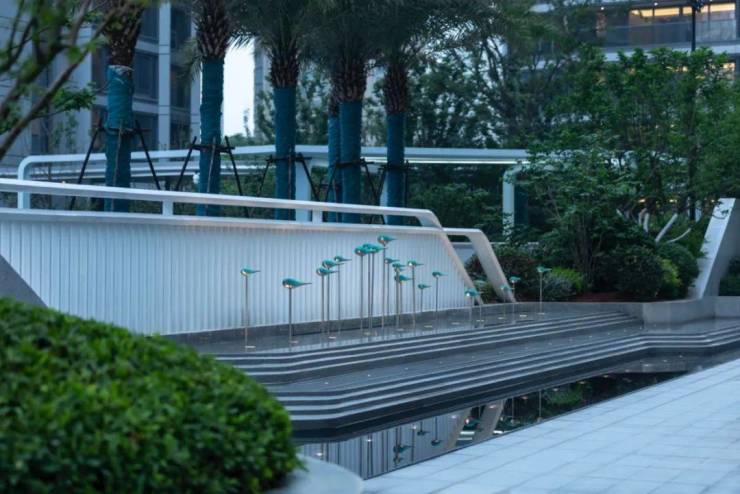 除了尺度感,臻奥院的归家仪式感和园区度假感也被“拉满”。回到小区,首先映入眼帘的是一片星光雨帘,水系前的雕塑,是一个醒目的“ONE”,在夜间尤其熠熠生辉,似乎提醒着业主,全城瞩目的两个“ONE”,在这里完成了时代的接力。