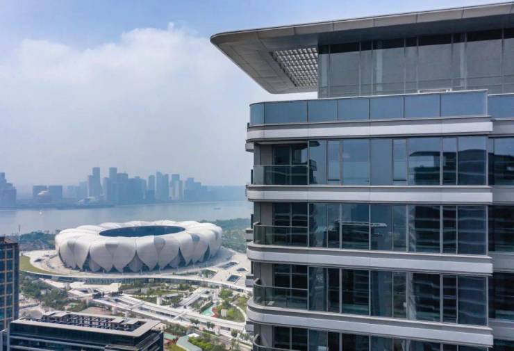 大尺幅的通透玻璃,仿佛无界空间,将室外景观引入室内。只需坐在客厅,就能俯瞰莲花碗,将钱塘江和日月同辉收入眼底,象征着更宽广的时代视野。