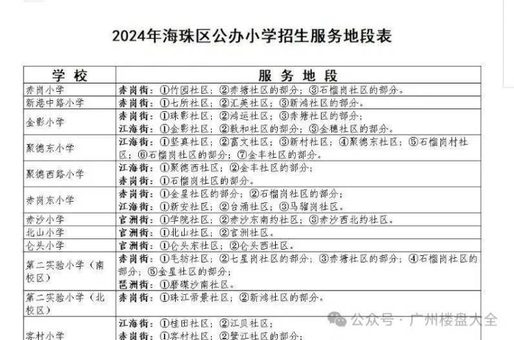 3、教育:项目按预售证登记的街道社区来看,大概率上的是赤岗东小学,不过其教育质量相对一般。附近还有赤沙小学、海珠小学、海珠中学(市一级)、聚德中学等学校。2024年海珠区公办小学招生服务地段表中,众多小学的服务地段涵盖了周边社区,还有项目西侧规划建设一所18班的中学,未来有望解决全龄段教育问题。