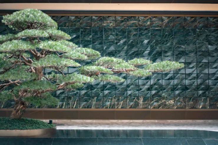 在主入口,首先映入眼帘的是高约3米的罗汉松,身姿挺拔,与两株冬青树一起,带来第一重归家仪式。