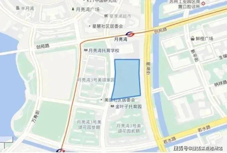比较可惜的是,地块大概率是没有湖景可看的,地块南面月亮湾美颂花园二期,东面是河流,隔河相望的是苏州生物医药产业园1期,东面是八达街,一路之隔是美颂花园一期,也是住宅小区,北面是月亮湾公交首末站。