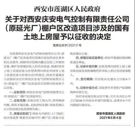 近日,西安市莲湖区人民政府在《西安晚报》上发布《西安市莲湖区人民政府关于对西安庆安电气控制有限责任公司 (原延光厂)棚户区改造项目涉及的国有 土地上房屋予以征收的决定(莲房征决字〔2021〕1号)》。