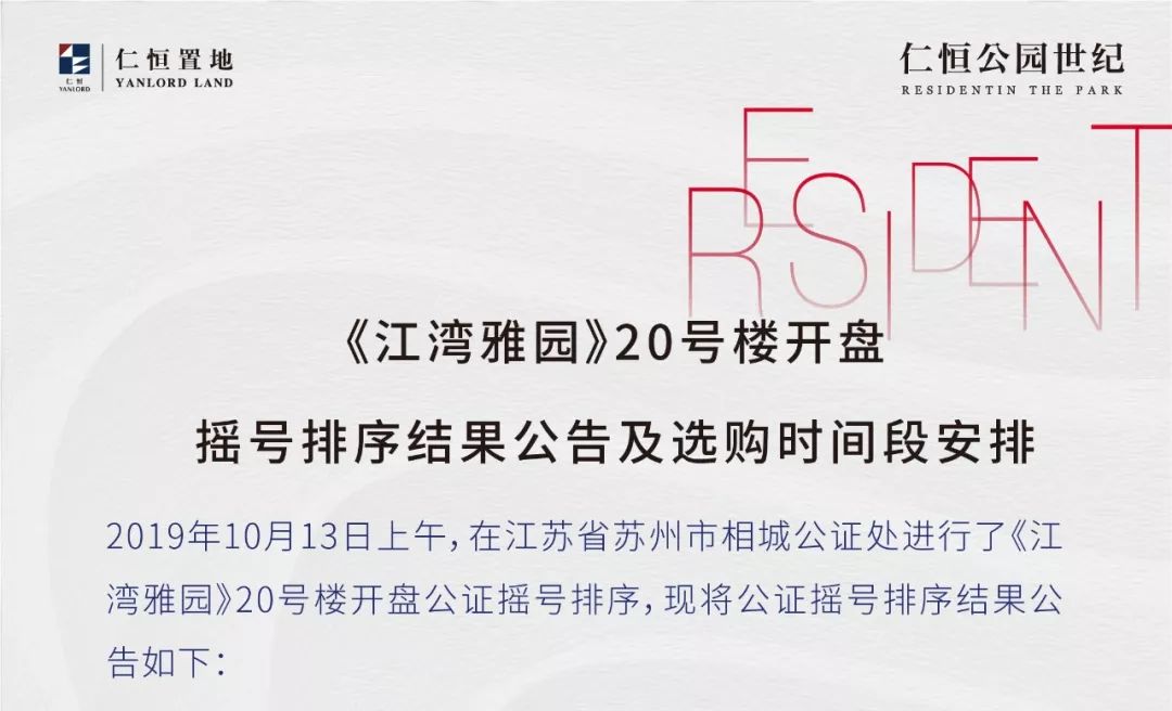 今天( 10 月 13 日)上午 10:00,仁恒公园世纪在江苏省苏州市相城公证处公证员监督下开始摇号排序(在公证处指定地点进行摇号排序)。