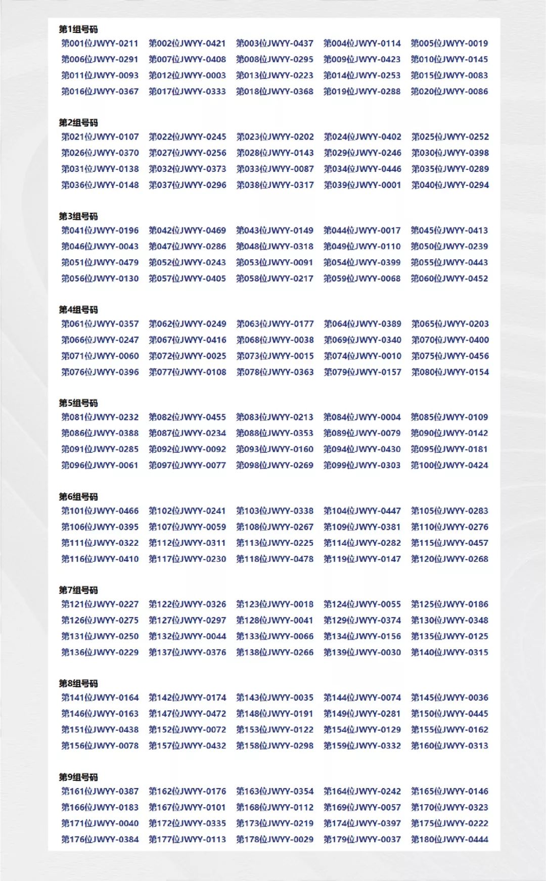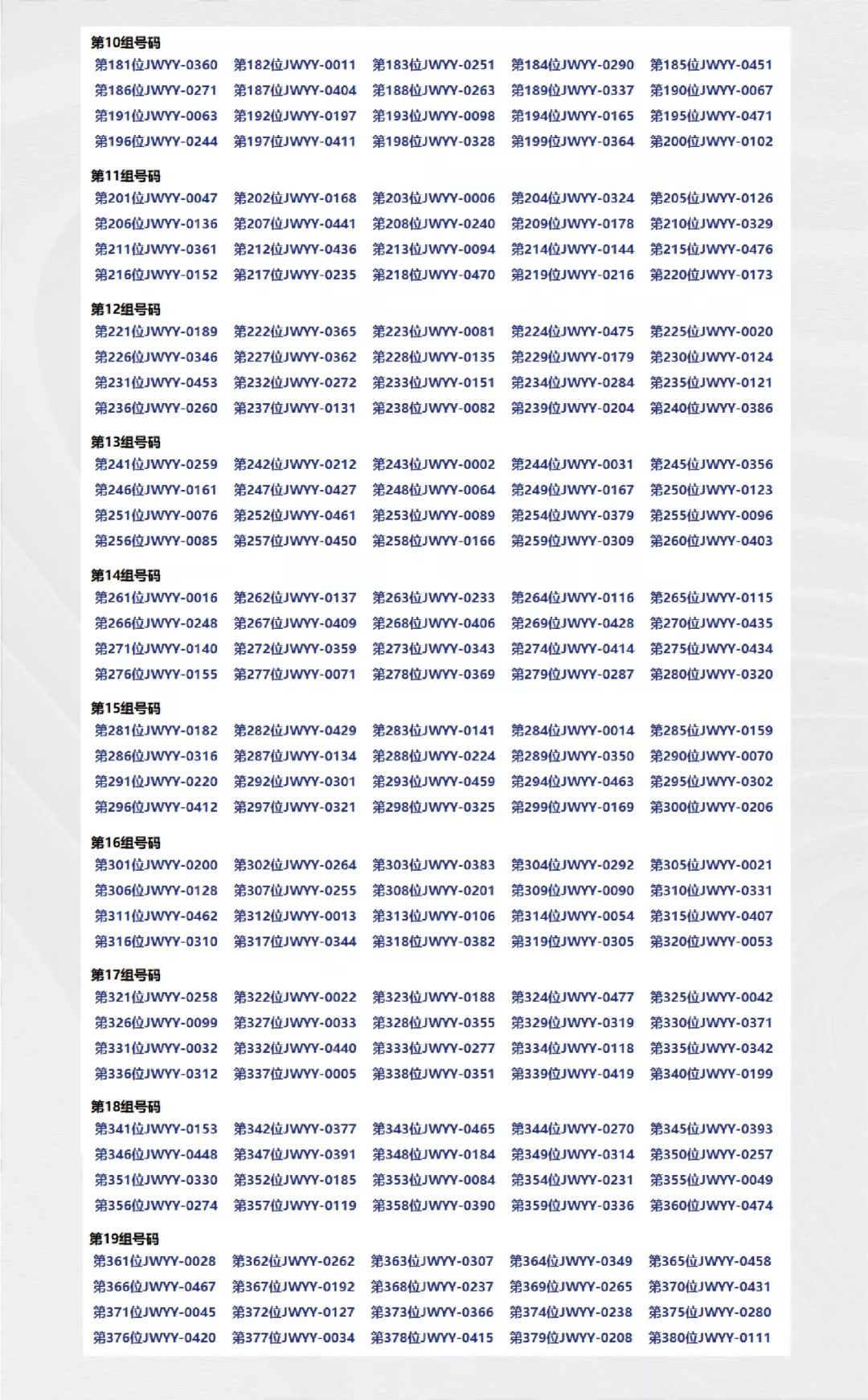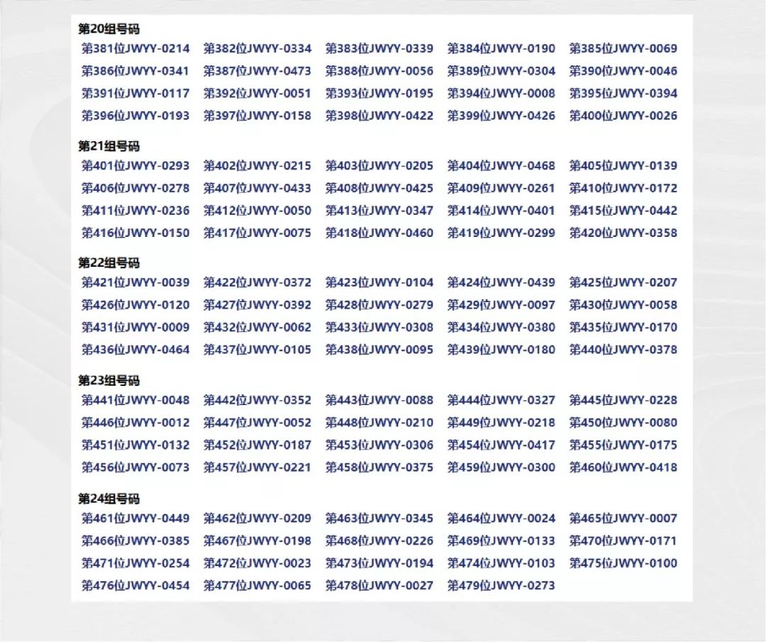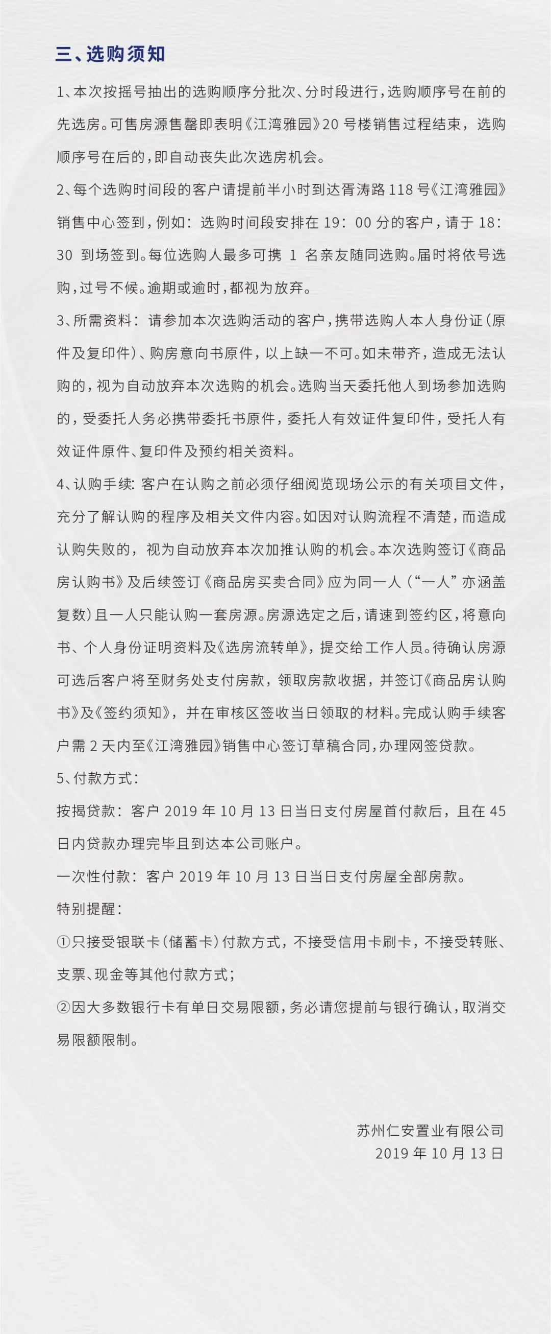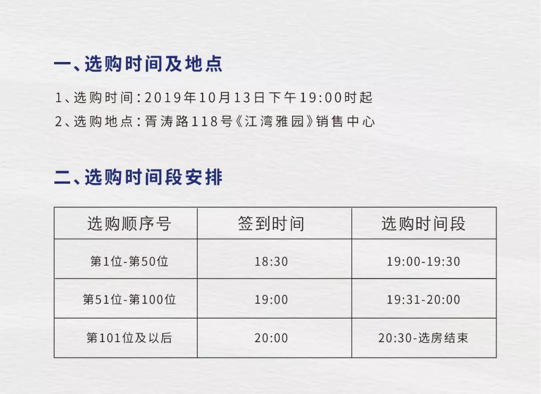 按照摇号排序的名单在2019年10月13日19时开始进行选房。选房地点在苏州市姑苏区胥涛路118号《江湾雅园》销售中心。《江湾雅园》20号楼开盘摇号排序结果公示及选购时间段安排如下