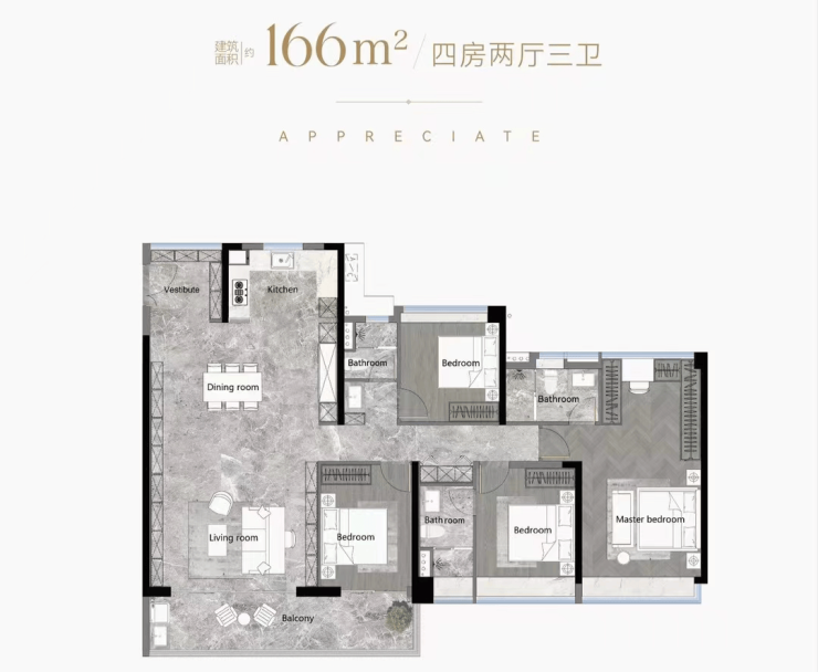 不仅做到了四房,还给到了四开间朝南、3.45米开间的客厅、5米多南向观景阳台和LDKB客餐厅一体化设计。
