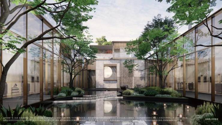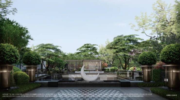 登门入府,约80米跨度城市景墙,宝石般中心水景,打造酒店化精奢前场迎宾礼序;地面铺装转译自苏州市花桂花纹理,约20㎡整面蓝翡翠奢石照壁,延续江南深宅大院的形制。