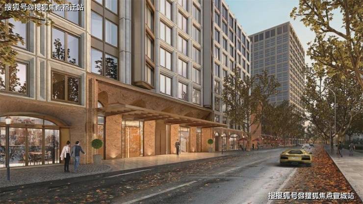 项目的风貌高层保留了古典建筑的三段式立面,基座的连续拱券以及头部的柱头,无疑是历史留下的印迹。而当代材料工艺的引进,则让建筑的美有了更丰富的层次。在高层的底层商业部分,项目选用了来自巴西的奢石波多尔红,搭配高难度的双曲面工艺,呈现出独特的优雅与魅力。商业以上的建筑立面,用巴西进口玫瑰金麻造型石材搭配局部铝板及金属线条,强化了现代感,传递出新旧交融的气质。