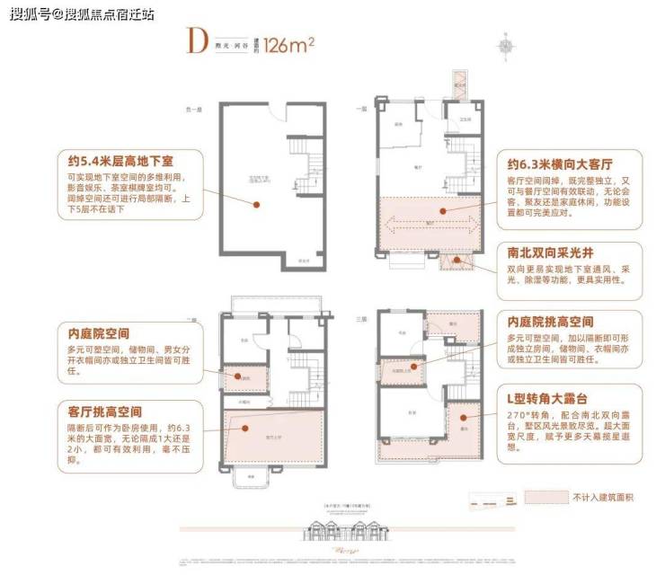 126㎡联排户型图,仅供参考,最终以实际交付为准一层约6.3米超大面宽客厅,无论是迎客厅”、“家庭厅”还是“志趣厅”的设置,都可以精致呈现。约5.4米层高地下室,纵享大尺度空间,加上大面积挑高可塑方案,可挑战N个126㎡的实用极限。