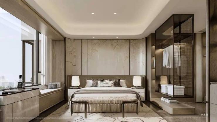 主卧套房尤其吸睛!以270°转角飘窗打破传统空间边界,配合双台盆、大尺度衣帽间等顶配细节,将奢华居住体验浓缩于每一寸空间。飘窗台延伸出的休憩区与窗外景观形成对话,让私密时光也充满诗意。