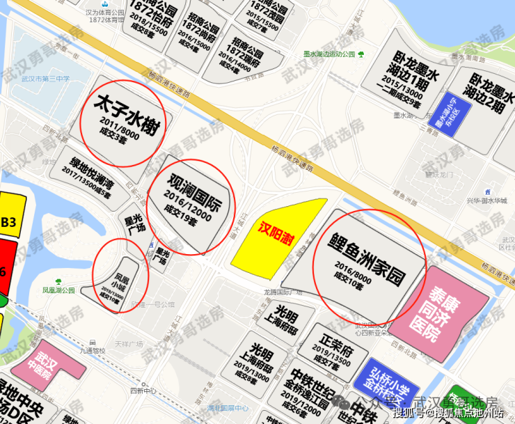 该楼盘位于汉阳——四新板块,不过呢,位置有点尴尬,位于杨泗港高架+江城大道交汇处。