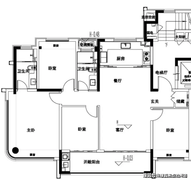 此户型为四开间朝南,客厅为方厅,开间4.2m,DBK一体化动区设计;开放阳台,开间7.2m;主卧套房设计,配备独立卫生间,三个卧室拥有飘窗。