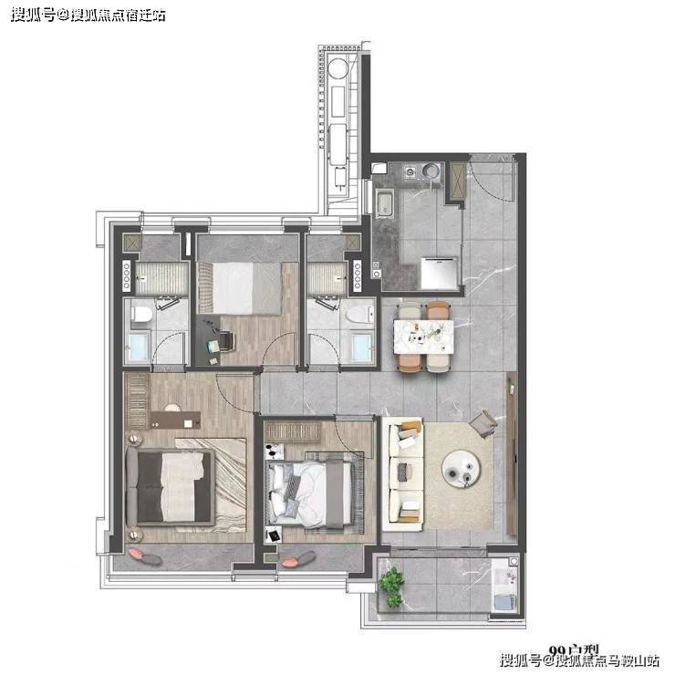 建面约99㎡的三房设计,在空间上使用功能更加多样化,一站式解决了家庭生活的所有功能,优化居家动线,大大提升空间的居住体验。