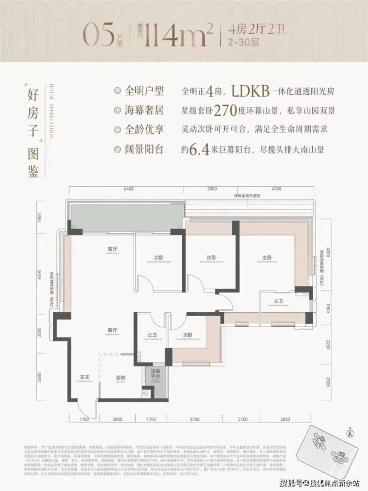 采用竖厅设计,南北通透,动静分区合理。得房率超高,通过设备平台、飘窗等赠送面积,实际使用面积接近120㎡。