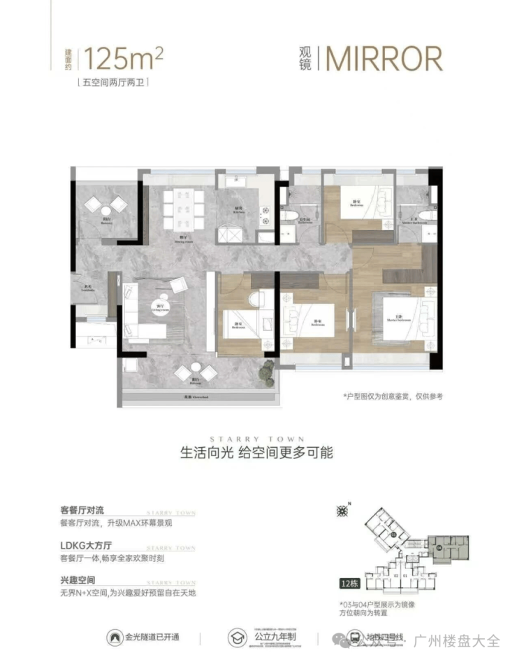 125㎡ 五房两厅两卫,南北对流,双面宽观景阳台,餐客一体化空间,适合改善型家庭。