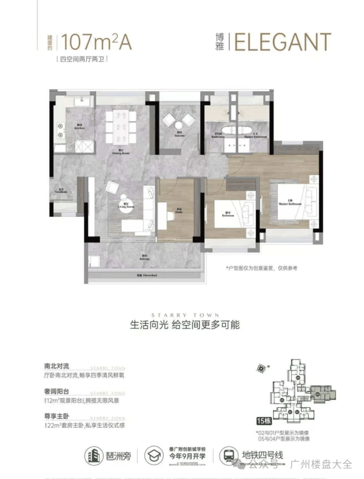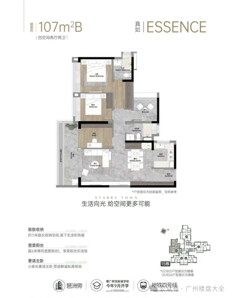 5、产品:越秀·大学·星汇城同样有足够精彩的设计,一来,全社区通过扭转楼栋实现景观视野最大化,推开窗户,不是校园景观就是园林景观,二来,从多维度升级产品,所有户型都是全南向四面宽,室内采光和通透性都加分不少。