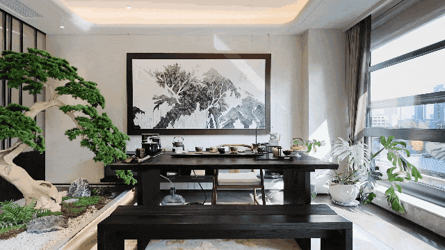 320样板房,以“海派东方”为设计之源,在传统文化与海派精神整体交汇的风格中,融入屏风、雕花、水墨等中式元素,传递东方美学的优雅浓缩。在“空中院落”,或琴棋书画,或诗酒花茶,品味人生八雅之乐;转身之间,约21.4米横向IMAX大面宽,让风景与光线的双重盛宴连绵入目。