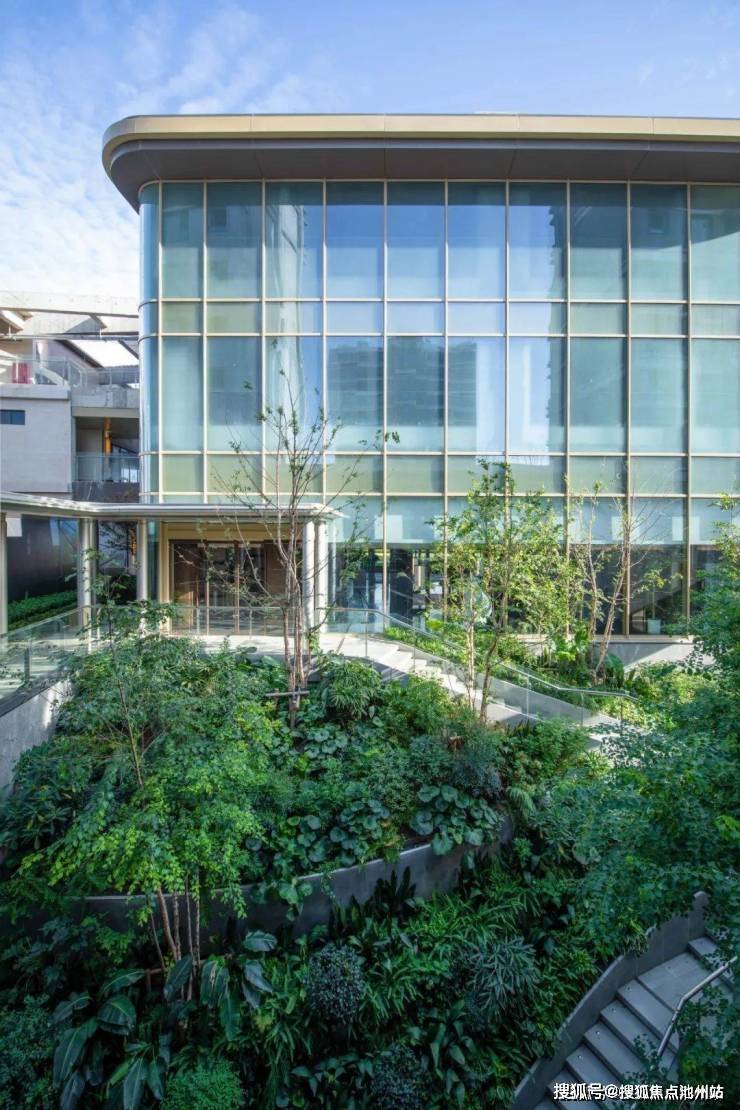 穿越秘境花园般的阶梯,回望中庭,台地斜坡植被连绵成“绿潮涌动”的曼妙画卷。