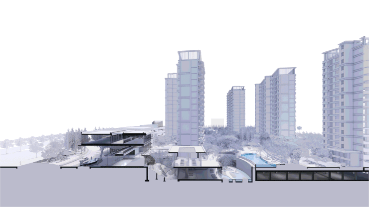 位于中央的环抱式绿岛,在双重杏林的序列下,将都市的繁喧逐渐引导至静谧的场域。
