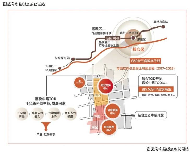 随着大虹桥科创功能西移发展的趋势,青浦新城基于“一城两翼,一带三核”发展战略目标,通过17号地铁线串联起三大核心节点,东起徐泾北斗产业基地,西到金泽华为研发基地,中部核心就是赵巷市西软件信息园,未来这条产业带上预期将会有数十万人口导入。