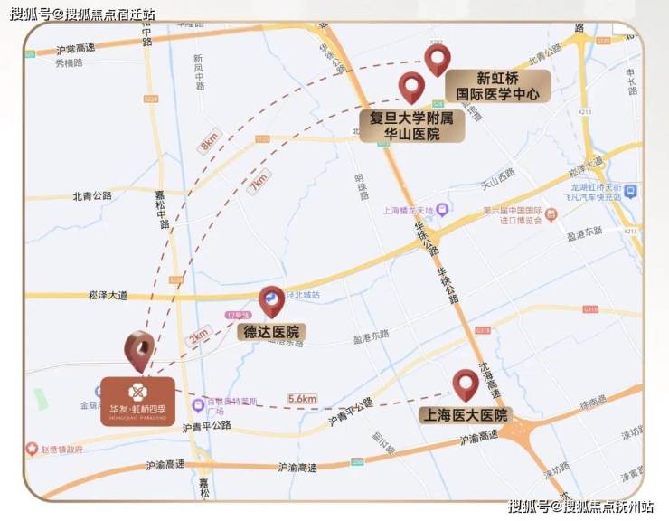 医疗方面,7公里内3家三级医院,约2公里到德达医院(三级私立医院)、约5.6公里到上海医大医院(三级综合)、约7公里到复旦大学附属华山医院(西虹桥分院)(三级甲等)