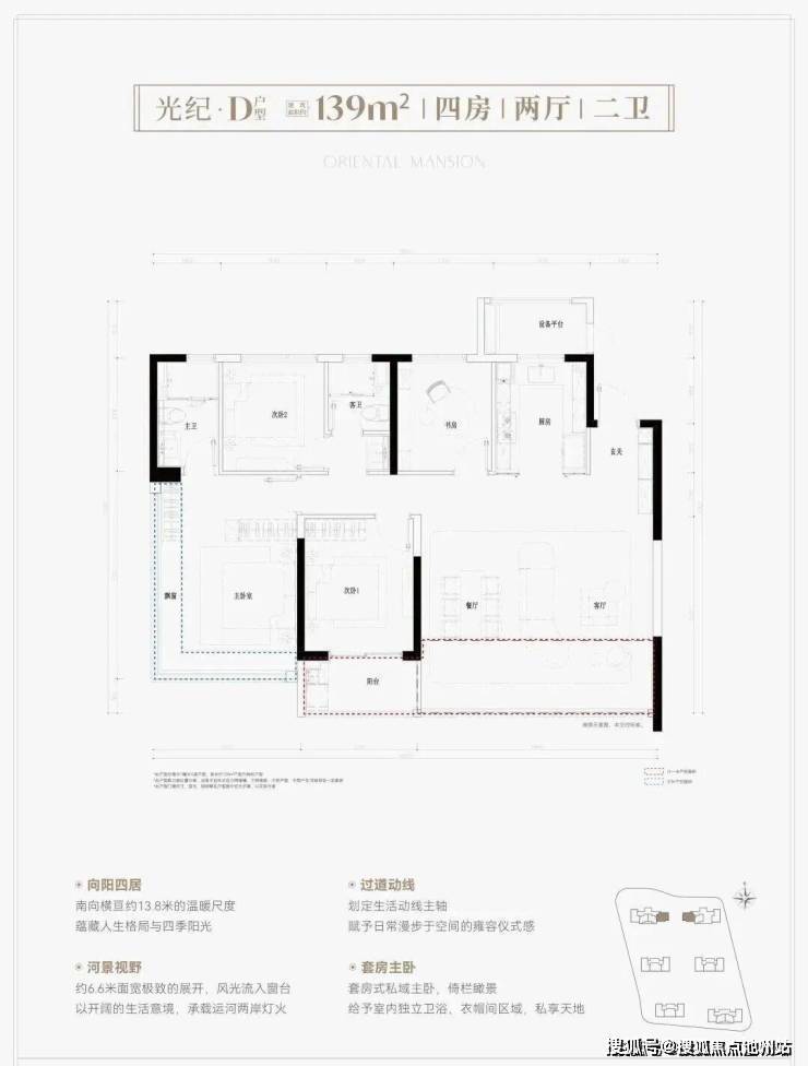 鸣澜里139平户型同样做的不错,打造四房两厅两卫,分为横竖两款,全部为边套,两梯两户设计。其中,139平竖厅户型亮点分析:①户型得房率超高,达到约93%;②南向3个卧室,采光优且满足二胎家庭和三代同堂居住需求;③客厅面积达到约37平,足够大,同时额外配置约2.6平的储物间。