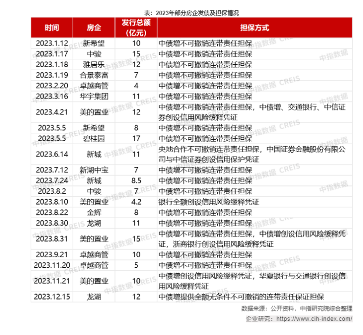 自今年“金融16条”落地,支持民营房企融资呼声不断。据中指院数据统计,2023年中债增及其他金融机构已为12家民营房企发行的超190亿元债券提供多种形式的担保。