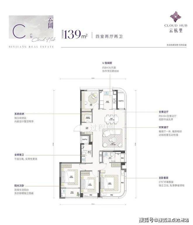 建面约139方4房2厅2卫边套,实得率约91%,布局“优秀”。全封闭式阳台,三面采光,观景视野无敌。