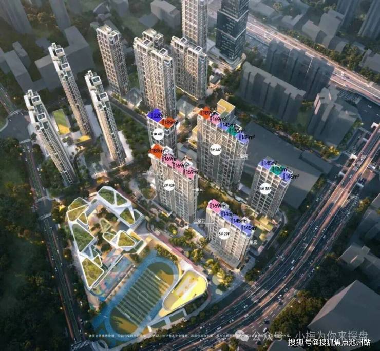该项目总共14栋住宅、1栋写字楼、1所九年一贯制学校、1所幼儿园。11栋超高层。一期共5栋楼,1栋高层和4栋超高层,户均165㎡,定位改善。面积段为130-225㎡所有楼栋均在1F或与商业顶层间设置架空层。整体成围合式布局,中间成中央景观,前后楼间距55.6米。这个间距来说不算很大。又有是超高层和高层结合。相比现代第四代住宅和低密的项目还是有点“刚”的。