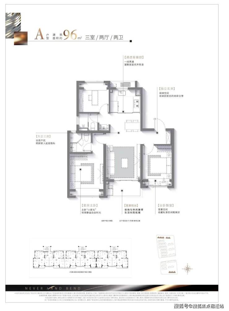 如建面约96㎡户型,性价比极高,是一个低总价上车3房的优质选择。经典飞机户型+三房两厅两卫设计,照顾家人的起居隐私;更有客餐厨一体化贯通设计,使得空间不设限更显大;主卧“小家化”,悦享静谧自由生活;进门处设置独立玄关空间,增加收纳的同时,也保护了业主隐私。