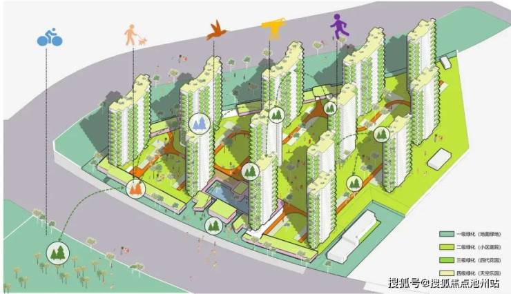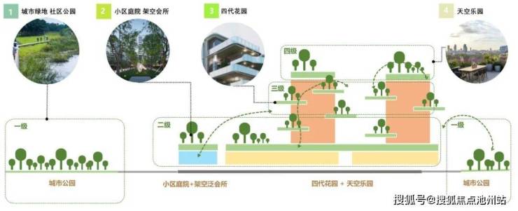 住区景观设计采用四级绿化体系,自下而上渗透到整个住区中,包含与城市绿地渗透融合的社区公园、住宅首层的社区庭院、楼栋间的四代花园和顶层的天空花园。四个层次的绿化结合功能布局、景观植被、充足的日照和多样化丰富的住区空间,共同构建了住区的整体面貌,展现了每一个组团空间的绿色焕新。
