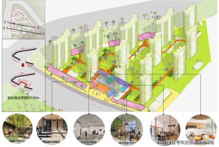 设计通过对商业价值的挖掘,以灵活的创意空间打造功能混合的社区边界。在西侧小区入口,结合开放式下沉庭院,打造“社区嵌入式商业”,通过向内部折叠的商业界面,融入社区食堂、社区健身、共享学堂、街道办事等社区功能,与临街商业融合,延长商业界面,激发街区活力,为社区注入浓厚的烟火气息,提升居民的日常生活体验。