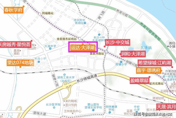 项目位于望城区腾飞路与金星北路交叉口东南角,距地铁4号线北延线(在建)金星路东延线站非常近,毗邻大泽湖湿地公园,南侧有一个教育规划用地,拟建一所36班小学,一路之隔便是长沙市一中大泽湖学校(九年制)。