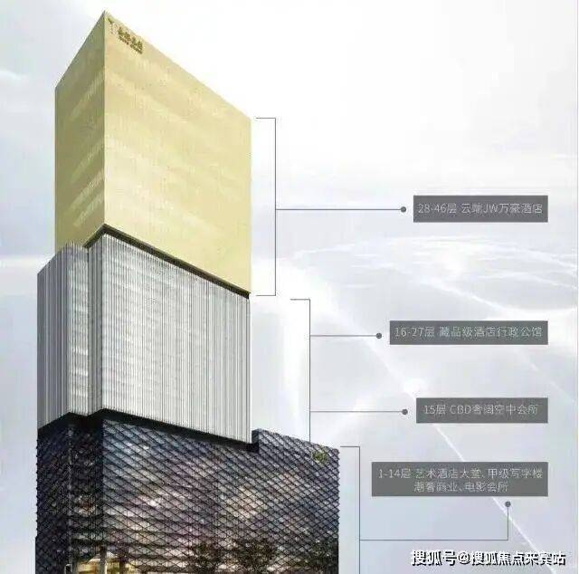 1-14层:甲级商务写字楼、精奢商业、高端影视会所//15层:高端私人酒店会所//28-46层:JW万豪酒店