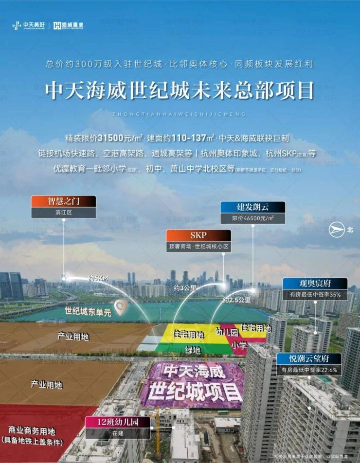 钱江世纪城新宁路与扬帆路,建筑面积:110、125、137㎡,精装限价:31500元/㎡(装修3500元/㎡),楼层:22-26层,层高:3米,套数:363套,绿化率:35%,项目特点:约6000方中心花园景观+无界泳池+主题架空层+星级酒店归家落客区+月映回廊!