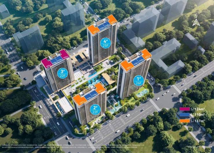 1#楼与北面4#楼的楼间距达到了约53米,四栋楼之间,是以「度假池」为核心的「悬浮水镜」1#楼的南面,则营造有约15米南向景观花园,更重要的是,整个南面视野无遮挡,世纪城的天际线,将和这座城市的璀璨,如同一帧帧被定格的画面,