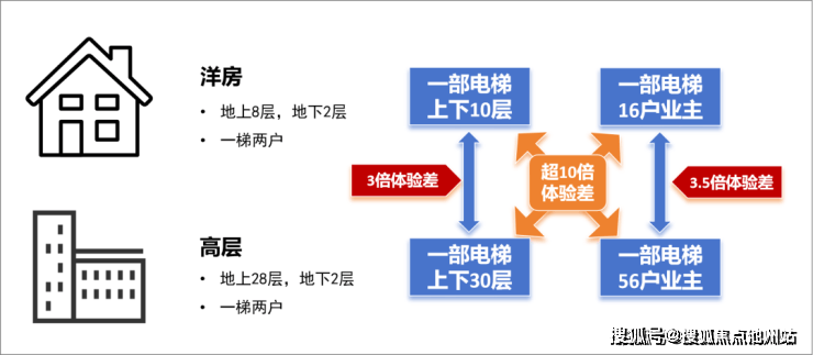 洋房的一部电梯只需上下10层,搭载16户业主;而高层的一部电梯需要上下30层,搭载56户业主。