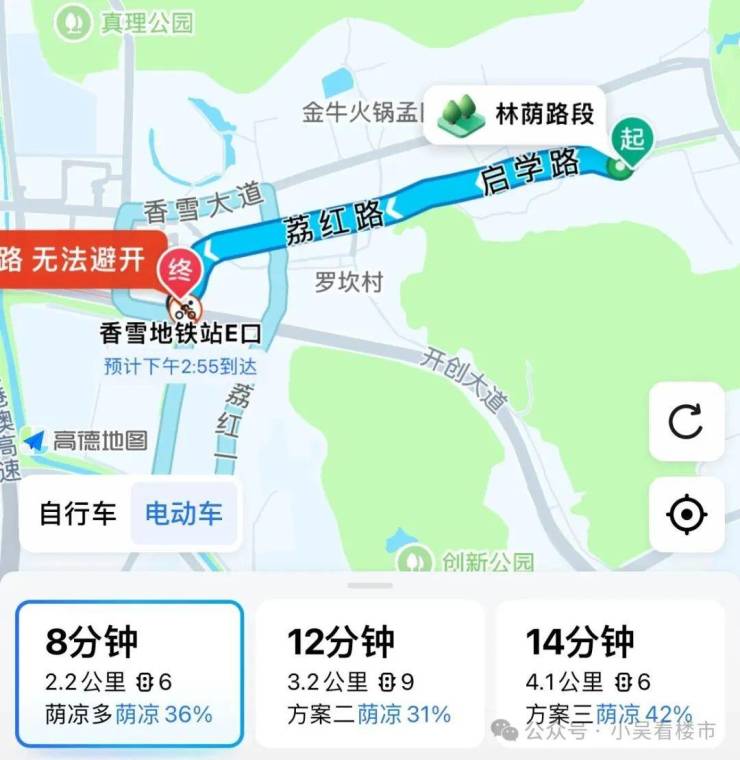 项目距离地铁相对较远,步行需要2.2公里,要走半小时左右,如果上下班需要地铁的话,只能依赖小电驴或者公交和有轨电车接驳了。