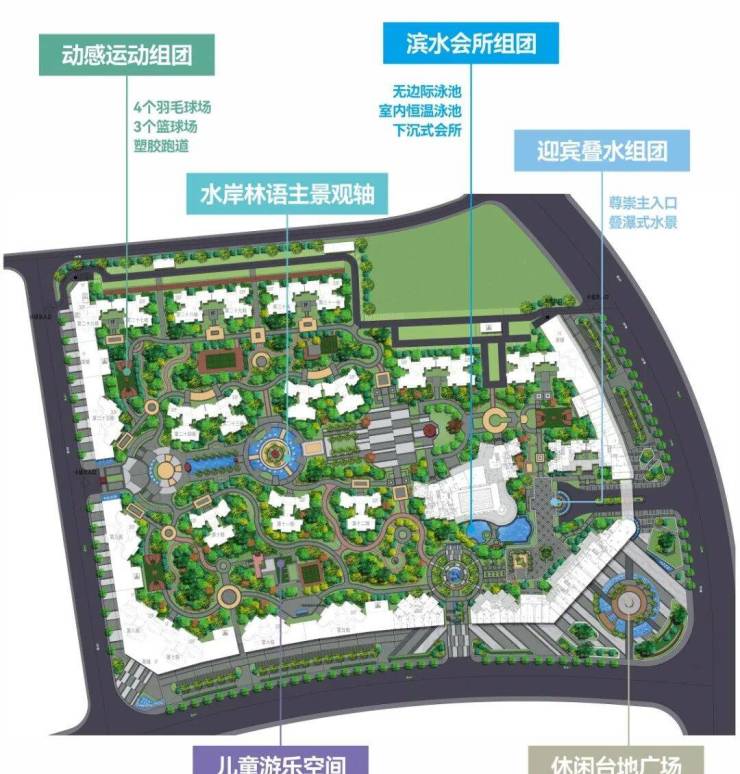 项目密植大量阔叶树种,以“鸣泉叠翠”、“天健翠庭”、“芳菲美地”、“水岸林语”、“天伦枫景”五大景致组团打造一步一景观景享受,打造天然绿色大氧吧,多点布局立体瀑式水景、4个羽毛球场、3个篮球场、200米标准塑胶跑道、儿童乐园等设施,首创坦南室内恒温泳池以及无边际阳光泳池,令业主可以享受公园式的生活空间。