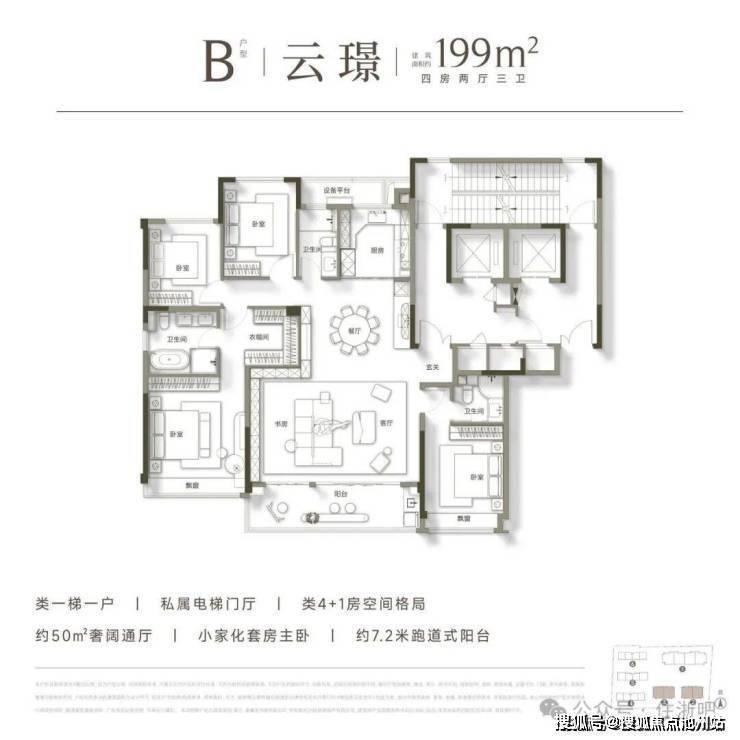 B户型主要分布在2幢和3幢,除了私属电梯门厅以外,B户型的格局上也更加突破,打造类4+1房的空间格局,主卧套房设计,预留独立衣帽间空间,整体约50㎡的奢阔通厅,可满足三代同堂居住需求,南向约7.2m跑道式阳台也让整个餐客厅空间更显阔绰。