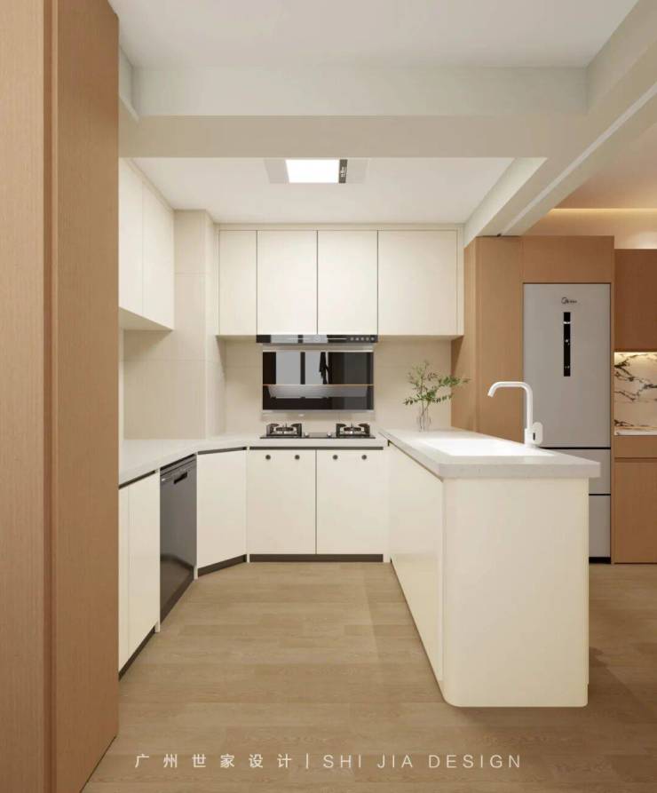 开放式U型厨房,收纳容量翻倍,动线精简流畅,一个转身即可完成洗、切、炒、盛整个流程。暖白色的橱柜搭配白色人造石台面,既美观又实现了功能分区。