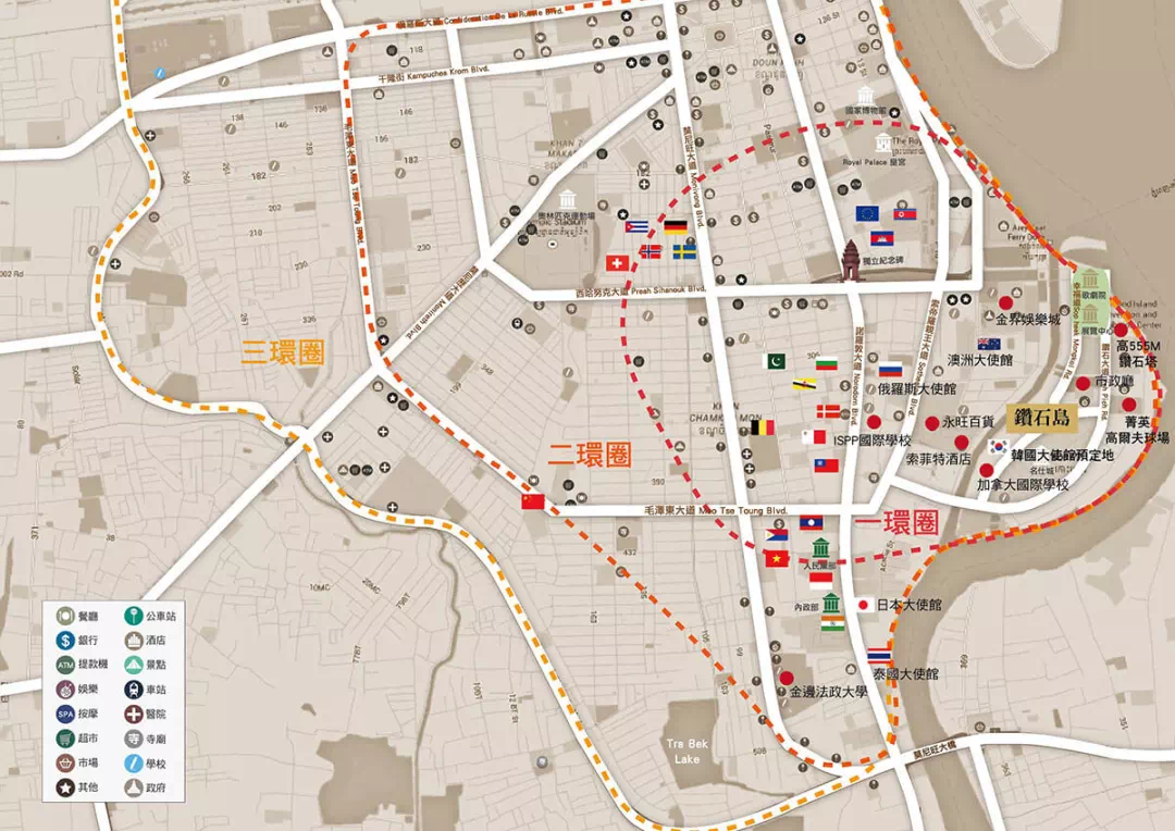 一般来说,都会生活圈的范围通常以CBD中心商业区的方圆500公尺为计算基准,在这样的圆圈里,越靠近行政中枢核心的价值就越高,通常在这样的区域内会分成2环,排名前列环与第二环的房价差距约5~10%,不过,每一环的距离会因为区域特性略有不同。金边的一环及二环即是以国会、总理府、独立纪念碑圆环为一环圈,含括钻石岛特定区,其他扩散为二环圈,至于三环圈则较金边市心较偏远。