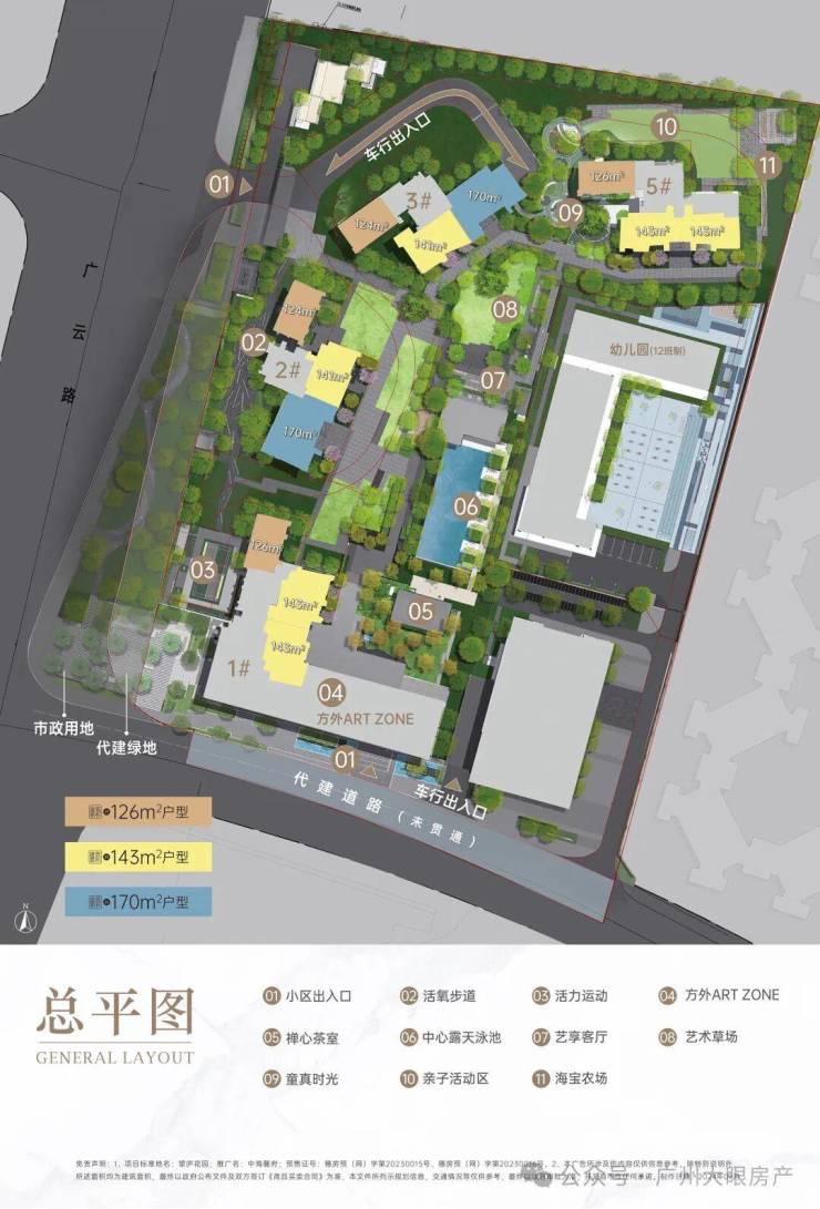 中海麓府体量不大,仅4栋住宅,40多层高的住宅(1#高40层,2-3#高44层,5#高41层),两梯三户,底下规划有1所12班幼儿园+1栋自持物业,货量在500套上下,它的面积段有三种,分别是建面约126㎡三房、143㎡和170㎡的四房