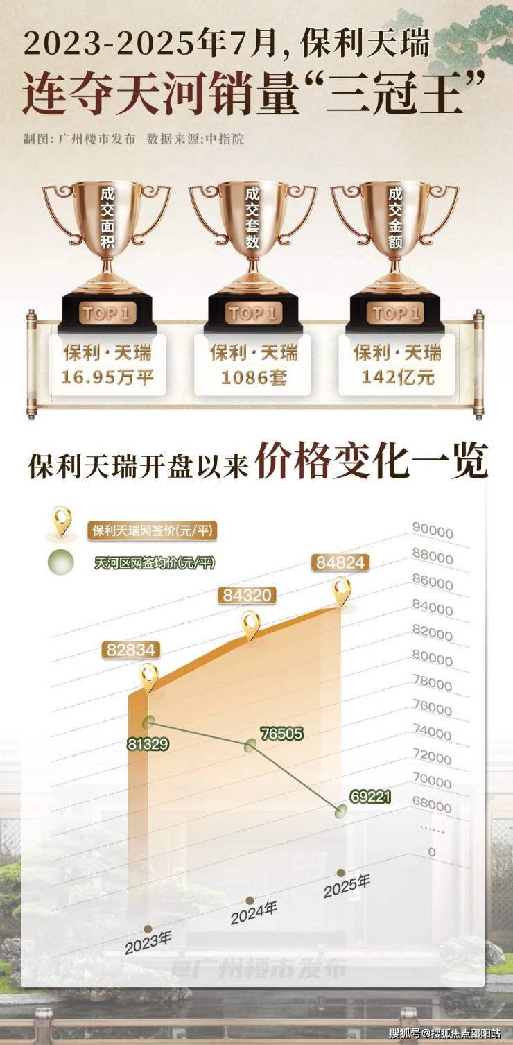 保利天瑞新房价格稳中有升,自2023年至今始终保持天河销量、网签面积及成交金额的领先地位,稳居区域销冠。